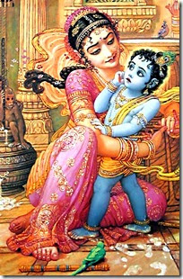 10.9.11. Holding by the hand, she threatened to beat Krsna, who was crying for having committed that offence, and was rubbing his eyes with his hand whereby the collyrium (añjanam) got spread all over and who was looking up (to his mother) with eyes bewildered and agitated with fear.